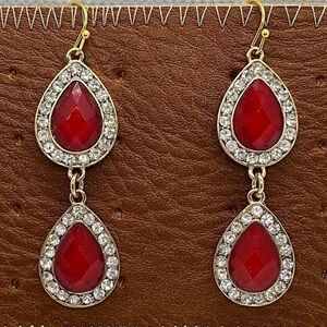 Red Pear Shape Two Tiered Drop Dangle Earrings with Rhinestone Paver Surrounding
