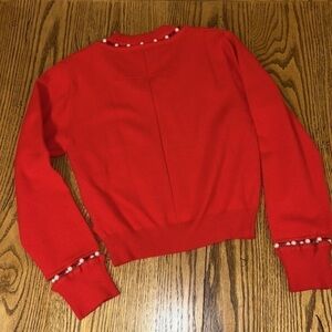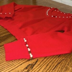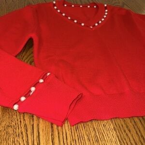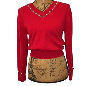 Red Pearl Embellished Hollow Out V-Neck Sweater