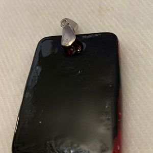 Very pretty artisan pendant of red, black, blue design. Lucite pendant measure 2" X 1 1/4". Foiled glass and crystal bracelet measures 8 1/2". Crystal earrings 1 1/2". All pieces are set in silver tone alloy. Very pretty three piece set at a great price.