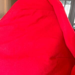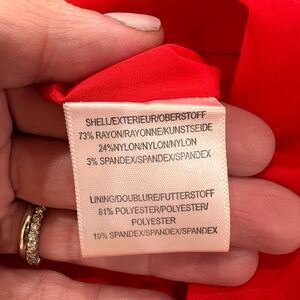 Striking red peplum cocktail dress from Belle Badgley Mischka featuring a deep V-neckline front and back, a sculpted sheath silhouette, and a flared peplum waist that defines and flatters the figure. Crafted from a structured stretch-blend fabric that smooths and holds shape beautifully. Knee-length cut with a hidden back zipper and clean lines that make it ideal for weddings, date nights, events, or holiday parties. Excellent pre-owned condition, worn twice with no flaws noted.