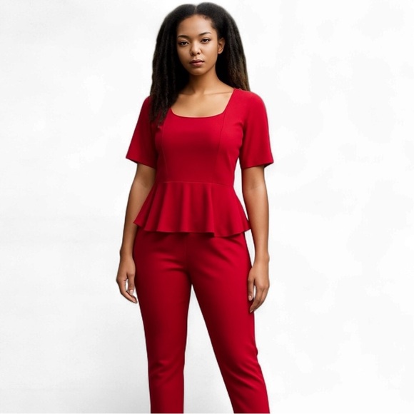 Danny & Nicole Red Peplum Jumpsuit with Exposed Gold Back Zipper , Square Neckline 26” inseam and short sleeve a tad longer than a cap sleeve - New Size 10