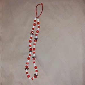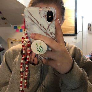 Homemade Red, white, and black phone bead accessory. This is about 7.5 inches in length. Strong materials are used so it won’t be easy to break. Some pics have filters and some don’t to show the true colors :) the modeled phone is an iphone x!