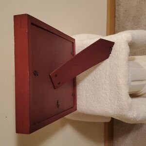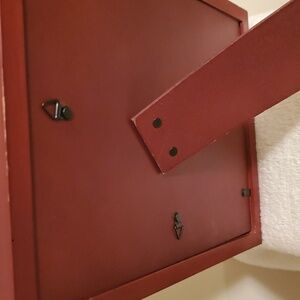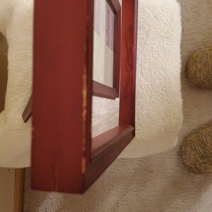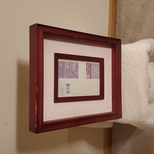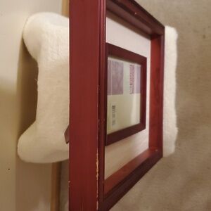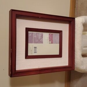 Enhance your decor with this elegant brown photo frame. Perfect for showcasing your cherished memories. Frame holds 4 in x 6 in photo. Brown wood with cream pattern surrounding the smaller frame. New never used but show some small imperfections.