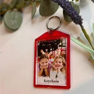 Vibrant red keychain with a photo insert. Perfect for personalizing your keys.