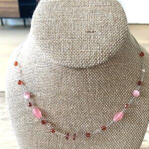 Red and Pink beads on a silver tone wire. Can be worn up to 17 inches long. Excellent condition.