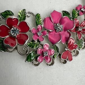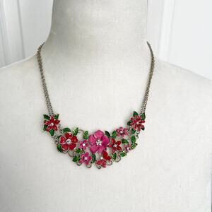Red & Pink Floral Rhinestone Studded Spring Summer Statement Bib Necklace on a Silver Tone Chain