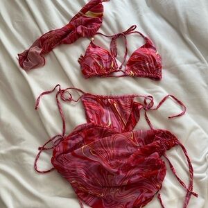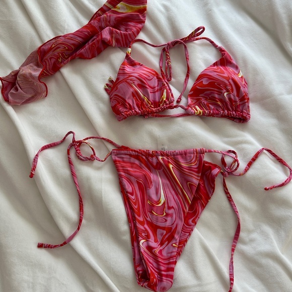 Two-piece string bikini with a vibrant marble swirl print. Triangle top with adjustable ties. Matching tie-side bottoms, skirt and hair scarf. Size L