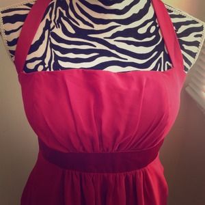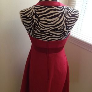 Cherry halter dress by Alfred Angelo. Halter has 2 adjustment levels for extra length. Thick ribbon under bust area and back zipper. Three layers add some volume to the skirt. Dress has a vintage pin up feel to it - very pretty! Cotton & polyester blend.