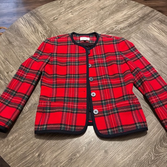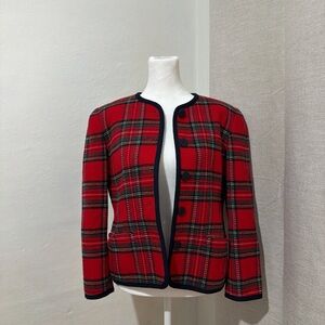 Timeless red tartan plaid jacket with black trim and button-front closure. Structured yet lightweight—perfect as a statement layer for fall, winter, or holiday outfits. Super classic vintage look that never goes out of style.