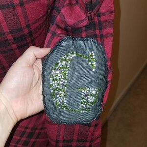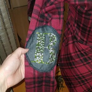 Black and red long sleeve top. Elbow Patch has B and G on them. Rocking my posh purchase. Button back split.