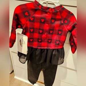 Adorable red plaid top featuring Mickey Mouse with a black tulle hem. Comes with matching black pants.12 months 2 piece baby girl.