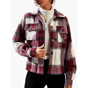 Red Plaid Print Button Down Cropped Flannel Cropped Bomber Jacket Shacket