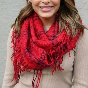 Red windowpane plaid soft knit infinity scarf with tassel fringe.