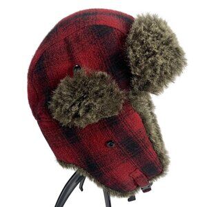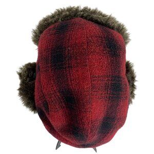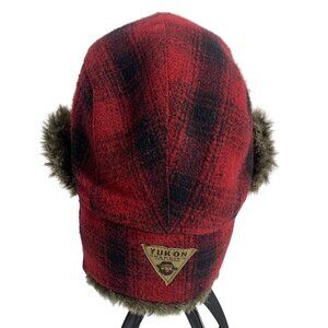 Red Plaid Yukon Charlies Trapper Hunting Hat Faux Fur, Ear + Chin Straps SZ L/XL