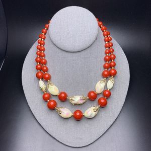 Red Plastic Multi Strand Beaded Necklace Mid Century Iridescent White Vintage