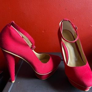 Closed toe platform 6 inch heels. Strap around ankle. Cherry Red with beige detail. Never been worn