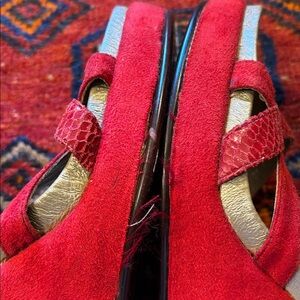 Red leather platform wedge sandals by GAZITH. I don’t recall if these are real leather or not. Not in perfect condition. Size 40. Fits like a 9.5 and somewhat narrow.