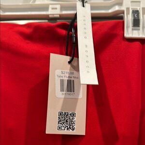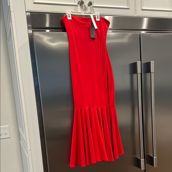 This striking red dress features a sleeveless design with a crew neck, perfect for a cocktail night out. The sheath silhouette is enhanced with pleated and ruffled details, adding a touch of elegance to its vibrant color. Its form-fitting style ensures a flattering fit, making it a standout piece for any special occasion.