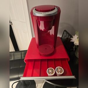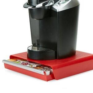 Drawer that organizes all your single serve coffee pods , and bottom rubber grippers keep it in place . Place your single serve coffee machine on top to save counter space.