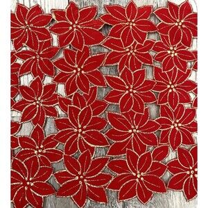 Beautiful red poinsettia embroidered cutwork table runner with gold stitching.