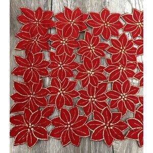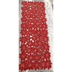 Red Poinsettia Table Runner Embroidered Cutwork Xmas Decor 35" x 13.5"