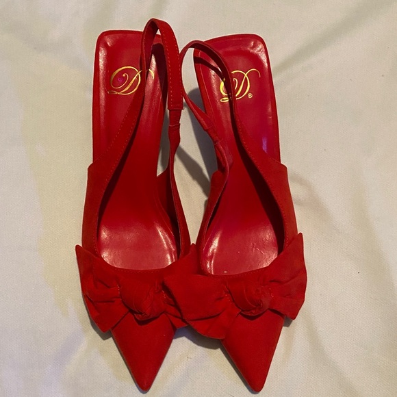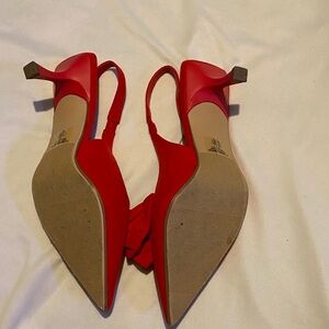 Chic red slingback pumps . Pointed toe with decorative bow accent. Smooth leather upper and slim silhouette. Secure slingback strap for wearability. Stylish choice for dressy looks.