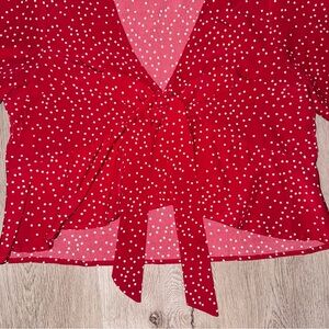 Chic and stylish red polka dot top with a tie-front design. Perfect for casual outings or a night out. Add a pop of color to your wardrobe.
