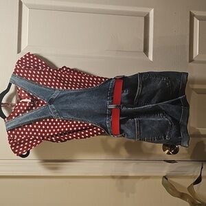 Red Polka Dot Top with No Boundaries Belt Loop Denim Overalls