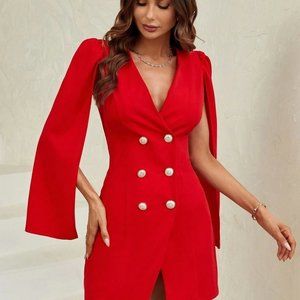 Red Preppy Womens Cloak Sleeve Double Breasted Placket Blazer Dress