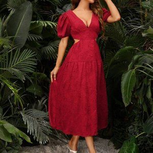 Red Preppy Womens Puff Sleeve Tie Backless Applique Jacquard Dress