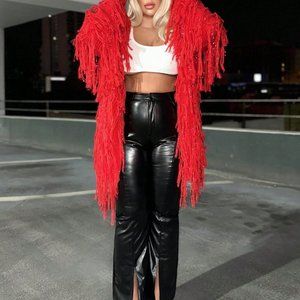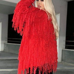 Red Preppy Womens Fringe Trim Open Front Cardigan