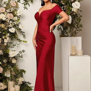 Red Preppy Womens Off Shoulder Ruched Split Thigh Dress
