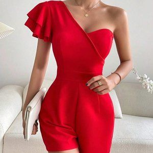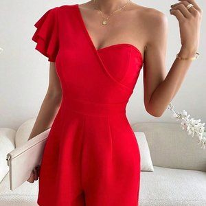 Red Preppy Womens One Shoulder Butterfly Sleeve Romper