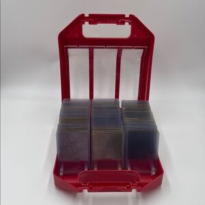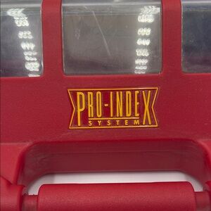 Red Pro-Index System storage box with clear panels. Ideal for organizing and storing items.