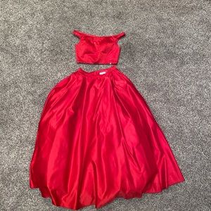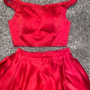 Excellent condition!! Worn once, ruby red two piece prom dress with rhinestone embellishments on the top, puffy and Flowy bottom piece. So so beautiful , make an offer!!