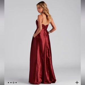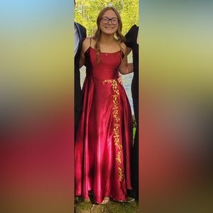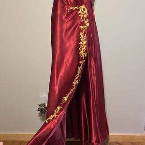 All orders ship within 1-3 business days! Red and Gold prom dress. Very comfortable and great for someone who is modest. I may be biased since it’s my dress but it truly is so gorgeous! Like new/clean condition/good condition/No holes/No pilling/No fade. The color is dark red with gold embellishment on the leg slit! Smoke free and pet free home!