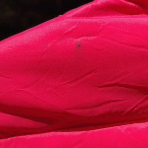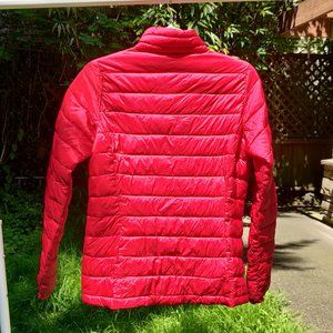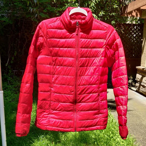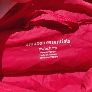 Simple Amazon Basics red puffer. Very light and packable, it comes with a stuffsack. Great for spring/fall, or layering while camping. There is a mark on the top left shoulder, shown in pics. I used to wear this while dog walking and it did me wonders! **Please excuse the wrinkles in the photos, I will give the piece a nice ironing before sending to you. Happy to answer any questions you may have!