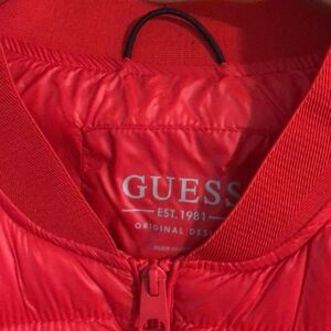 This is new with tags. The color is red. The shell is 100 % nylon with polyester fill. Lighter weight with snap pockets. The chest is 46 inches, 23 flat. The length is 29 inches with 27 inch sleeves with a zipper pocket.