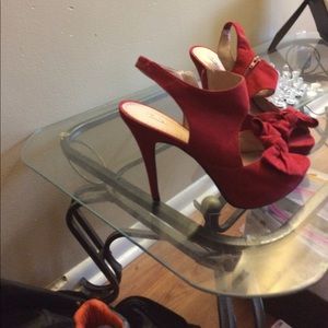 Suede, peep toe, red heel. Stiletto heel, platform front with a nice red bow