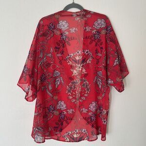 Red Purple Floral Kimono Size L Mesh Sheer Bohemian Colorful Beach Swim Cover