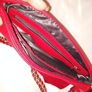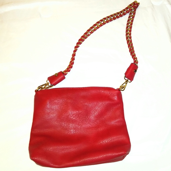 Red faux leather purse with gold lined chain strap. Interior has 2 additional pockets and a zipper.