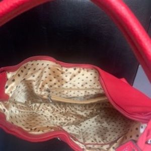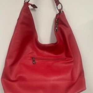 New never been used. Two zipper pockets on the front and one zipper pocket on the back. The inside has a zipper pocket and two open pockets with a small zipper compartment.