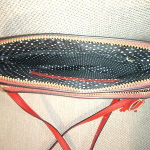 Feel free and fashionable with this adjustable single-strap red purse with two compartments. Fantastic condition with a coin and cash zipped pocket, a slot for a cellphone or cards, and a smaller compartment for other items.
