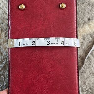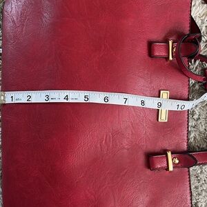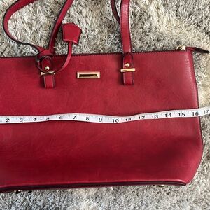 A beautiful red purse/satchel in excellent condition. It is not a bright red. Synthetic leather. No brand name. It’s not a stiff purse, it has a nice feel to it.