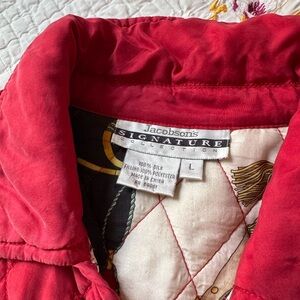 Stylish red quilted jacket with a patterned lining. Perfect for a chic look.