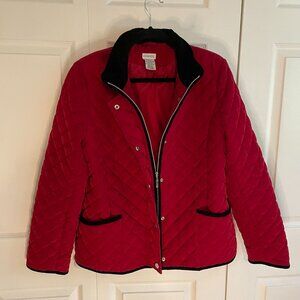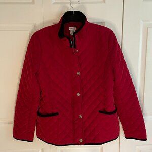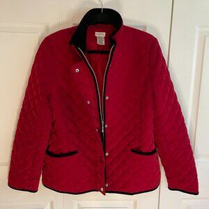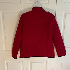 Perfect for fall/early winter! Lightly worn red quilted jacket. No flaws, pilling or stains. Pocket edges, sleeve edges and collar are lined with black velvet-like piping. Size L (12-14)