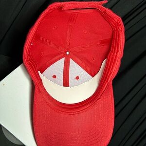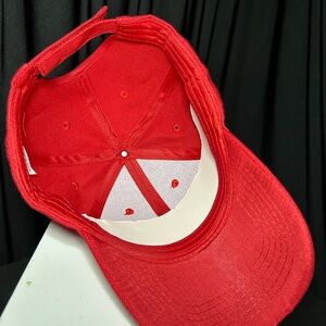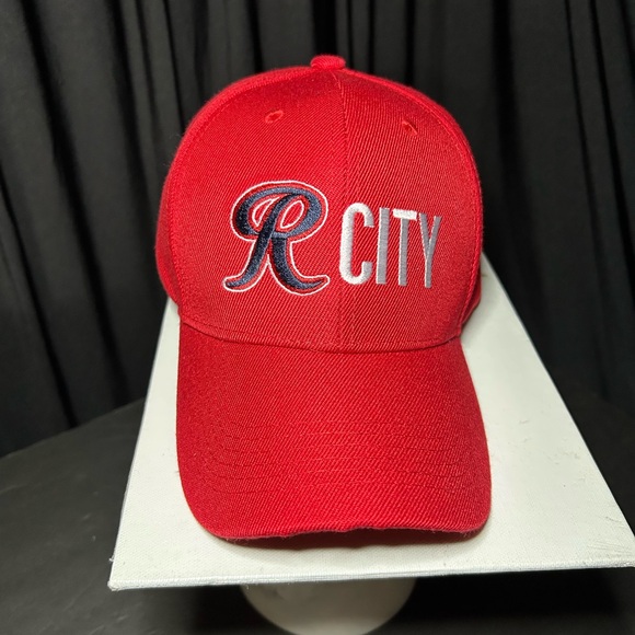 Stylish red baseball cap with 'R City' embroidery. Perfect for casual wear.