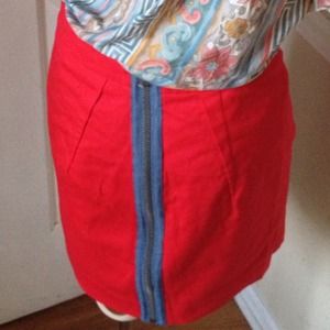 Vibrant red high waist mini with blue back zipper; cotton/spandex blend. That's Hot!
