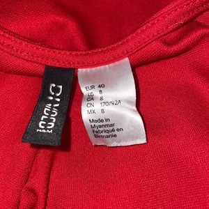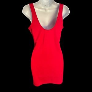 Red fitted mini dress with a black and white stripe on either side.