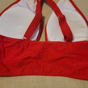 Vibrant red bikini top with a racerback design. Soft, smooth fabric with light padding. Simple, flattering silhouette.